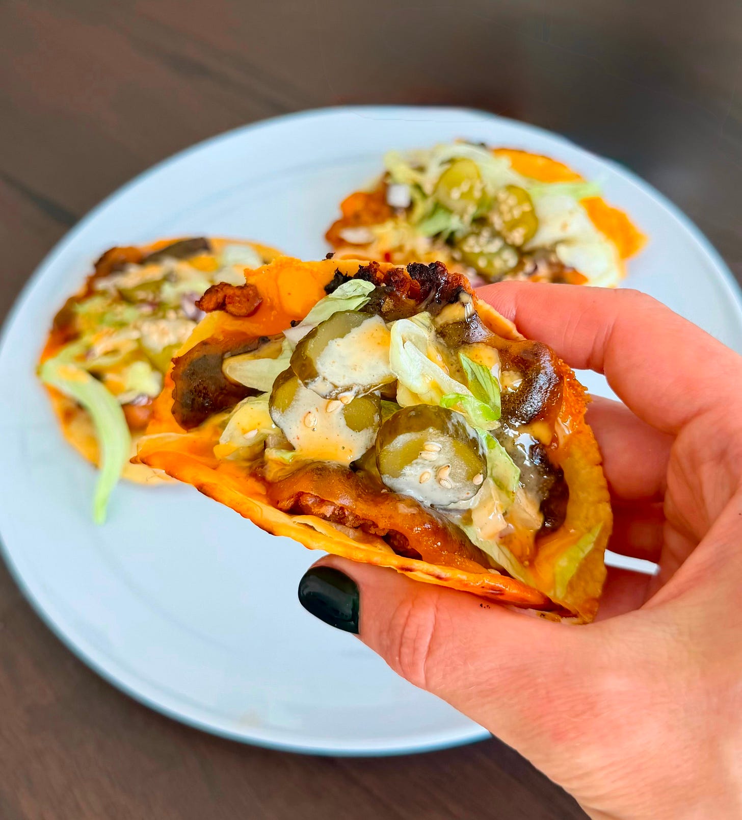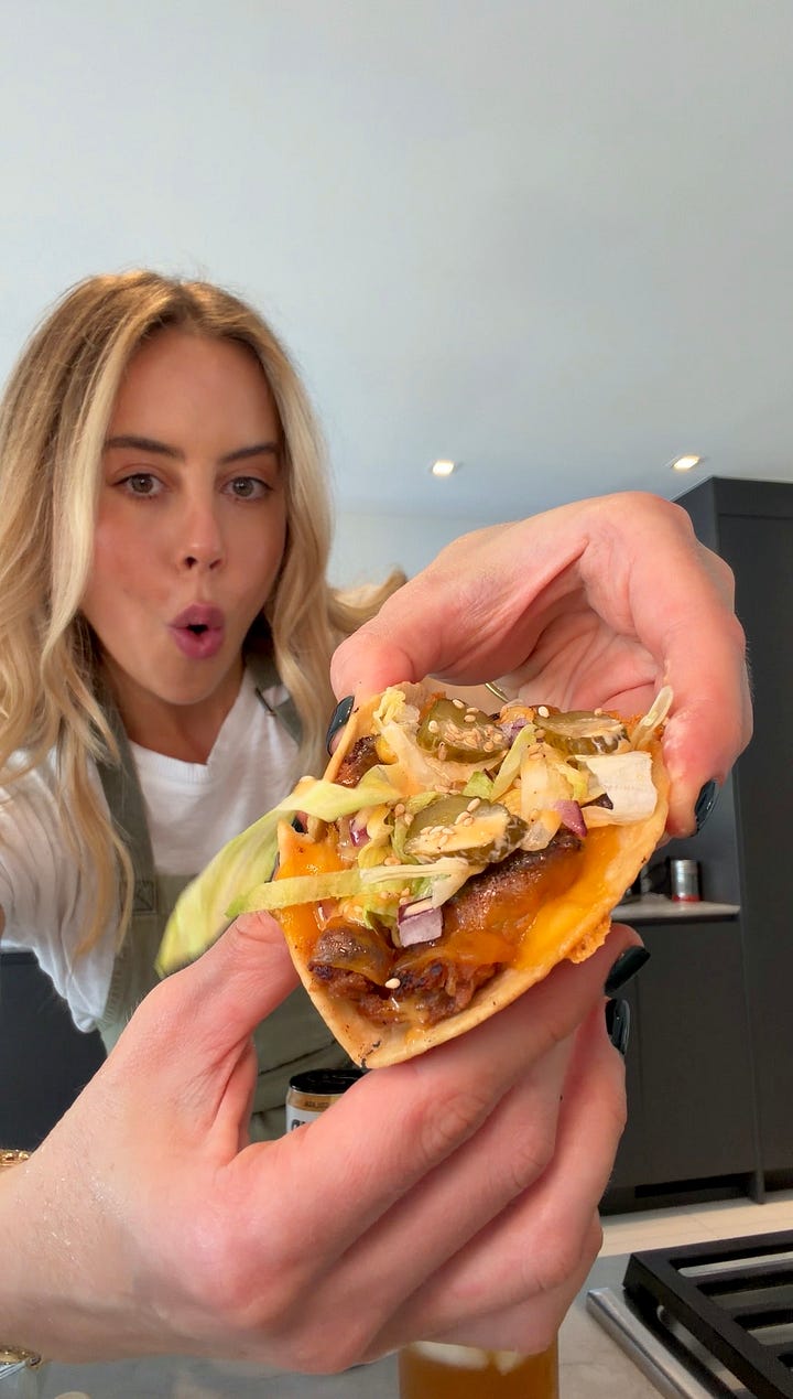 This is what happens when a Big Mac grows up, hits Erewhon, swaps the bun for almond flour tortillas, and gets a crispy cheese personality upgrade. She’s nostalgic, she’s protein-forward, she’s dairy-free but still dramatic. And yes, the frico edges are in fact intentional.