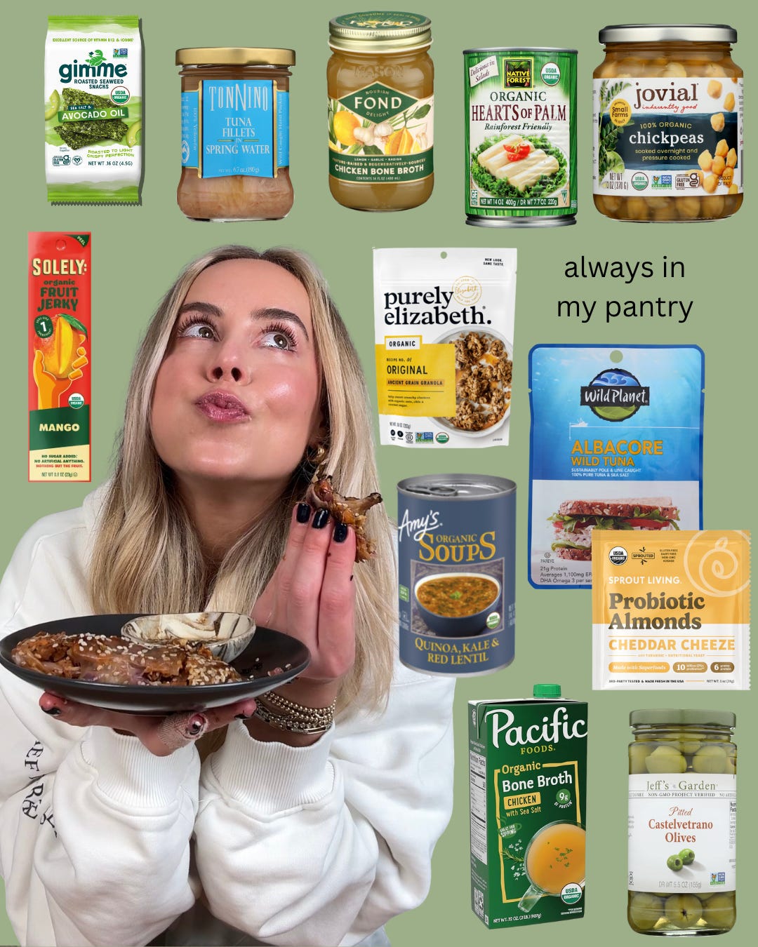 These are always, always, always in my pantry, and if you’re my assistant you will absolutely catch me sipping bone broth straight from the jar, snacking on tuna, and double-fisting a can of hearts of palm on the reg: