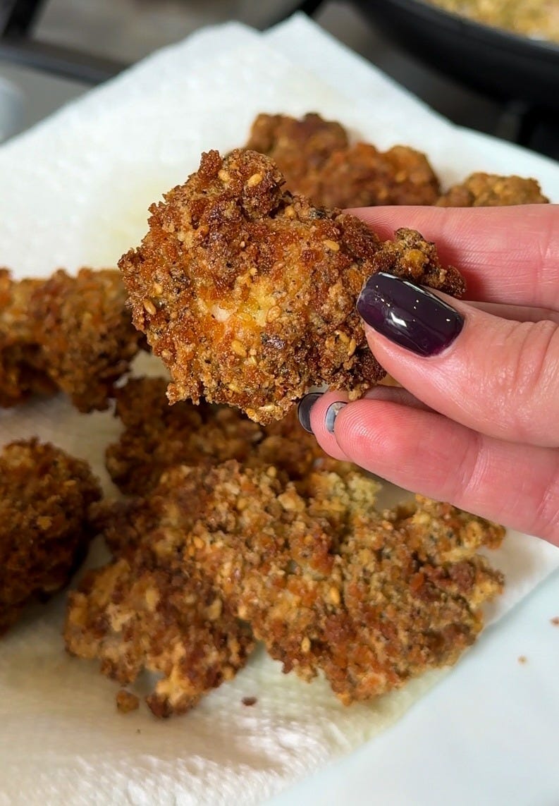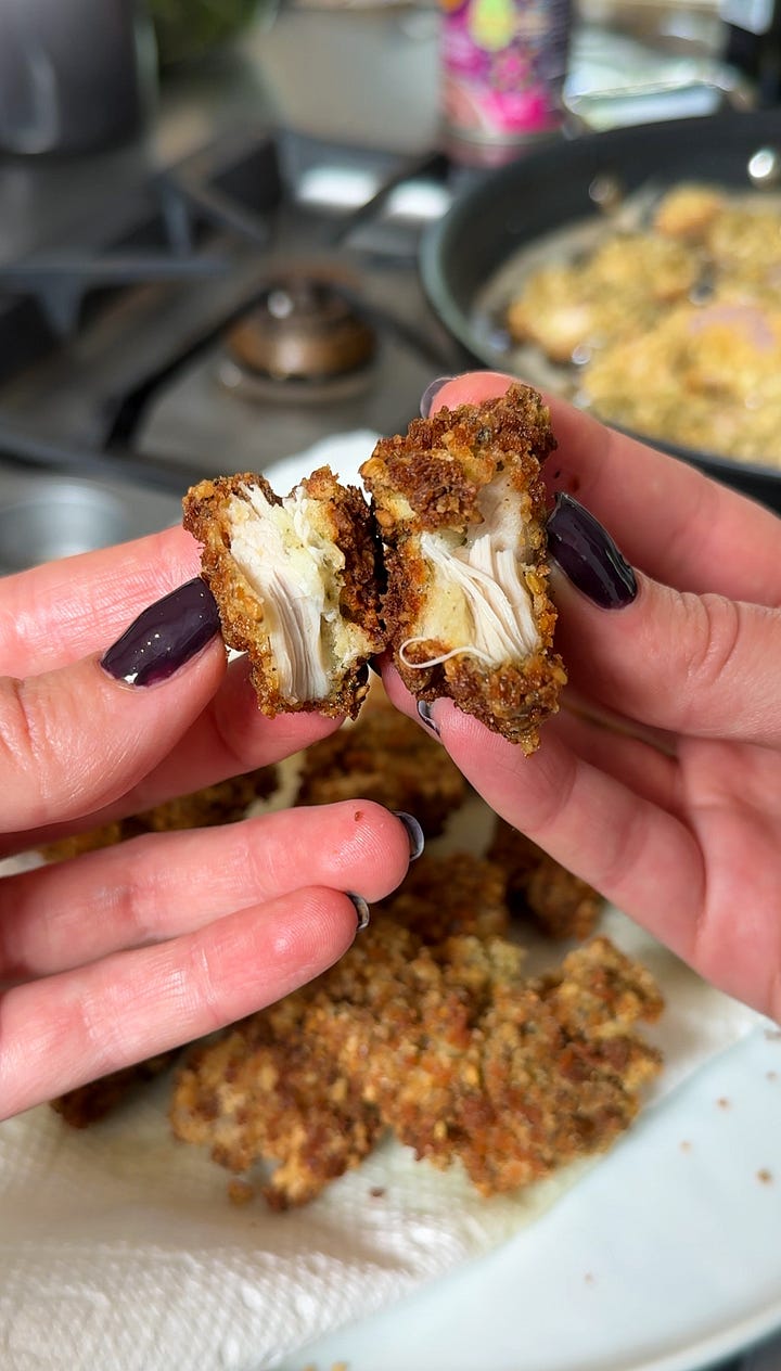 Cook each nugget for 3–4 minutes per side, or until golden brown and fully cooked. Note: almond flour tends to sink and burn over time in hot oil, so the panko-almond blend is a better option for larger batches or longer fry sessions.
